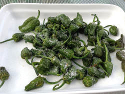 They are picked while small (1-1.5 inches in length or so), fried or sautéed whole in oil, and then served sprinkled with coarse salt. Better yet, travel to Spain during the summer and enjoy the real thing as an appetizer or at tapas restaurants.